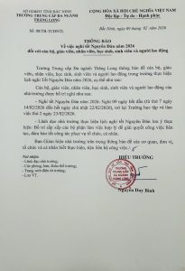 Nghỉ tết Nguyên Đán năm 2026: Nghỉ 09 ngày bắt đầu (từ thứ 7 ngày 14/02/2026 đến hết ngày chủ nhật 22/02/2026), trở lại Trường học tập và làm việc thứ 2 ngày 23/02/2026.